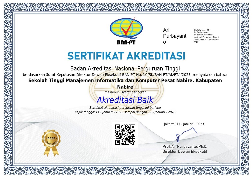 The Bachelor of Informatics Program at STMIK Pesat Nabire has also been awarded a “Good Accreditation” rating by BAN-PT. This recognition reflects the program’s dedication to developing a relevant curriculum, strengthening research and innovation, and equipping students with both practical and theoretical skills aligned with the current demands of the digital industry.
