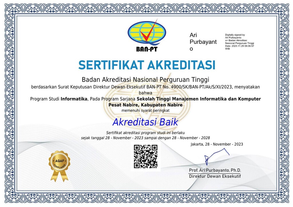 The Bachelor of Informatics Program at STMIK Pesat Nabire has also been awarded a “Good Accreditation” rating by BAN-PT. This recognition reflects the program’s dedication to developing a relevant curriculum, strengthening research and innovation, and equipping students with both practical and theoretical skills aligned with the current demands of the digital industry.
